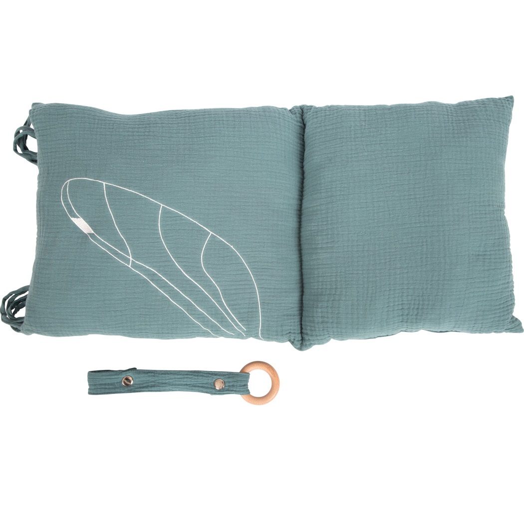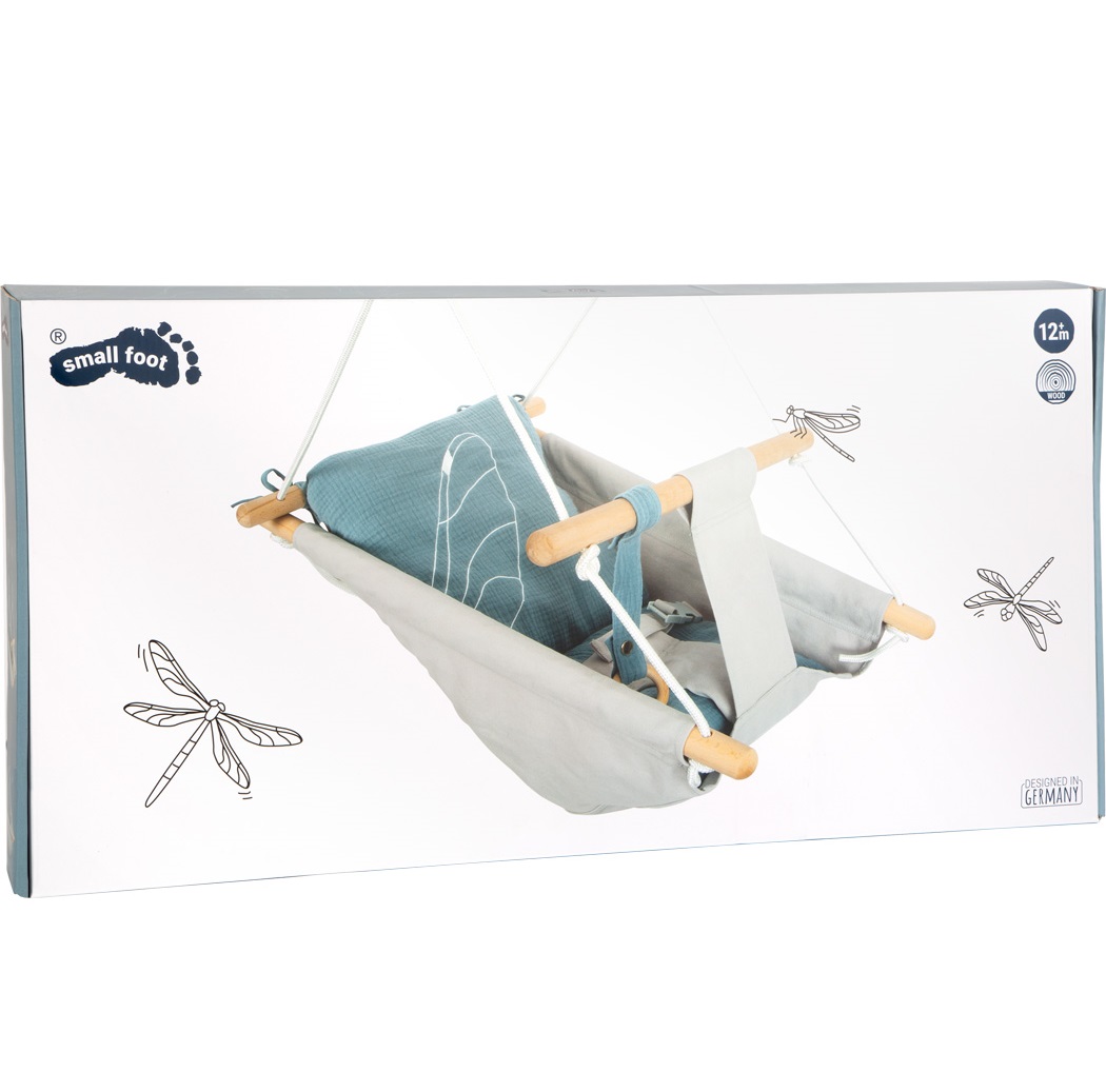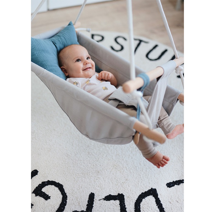 The highly visible wood and other natural materials and the trendy smoky blue colour make this baby hammock an absolute eye-catcher! It’s just the thing to make babies relaxed and content! The rounded edges of the wood and their soft shapes ensure pleasant haptics and plenty of safety. The removable cushion can be attached tot he swing with loops. A pressable button secures the grip toy/teething ring, and other accessories such as a dummy or toys can also be attached to the swing.