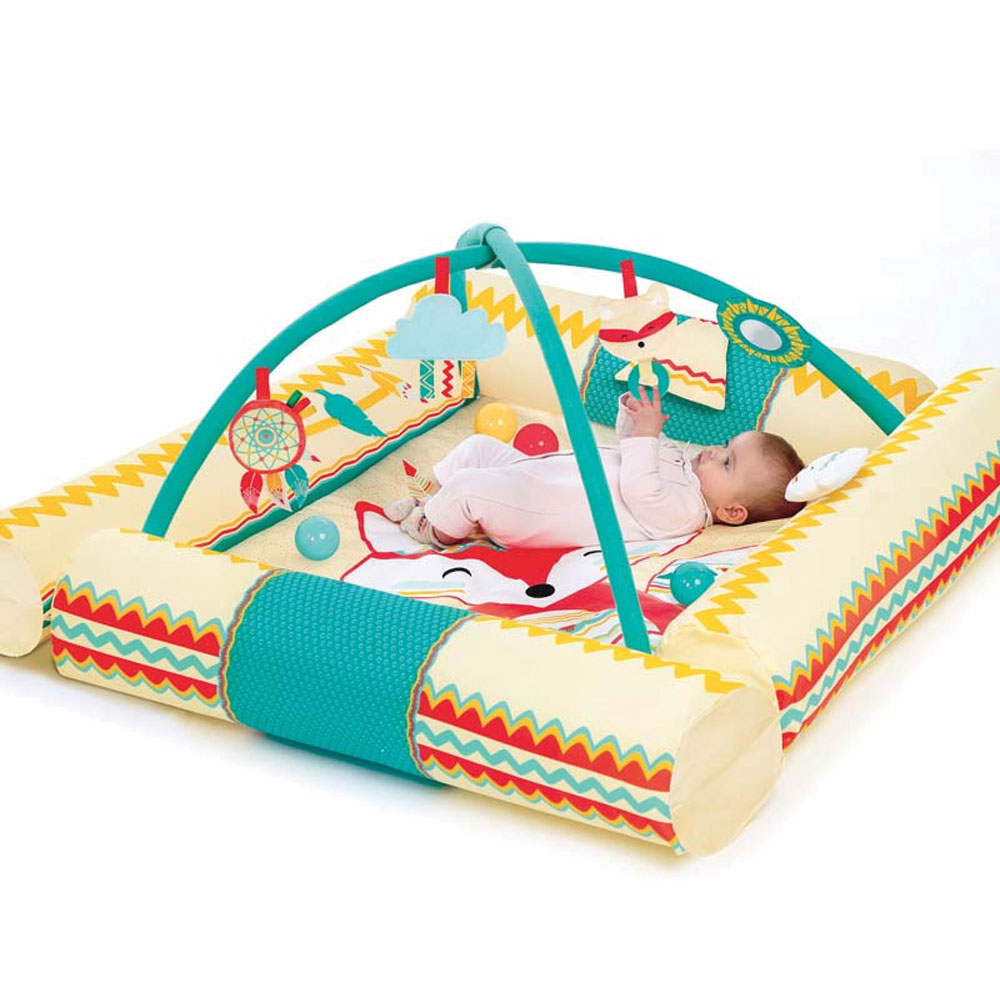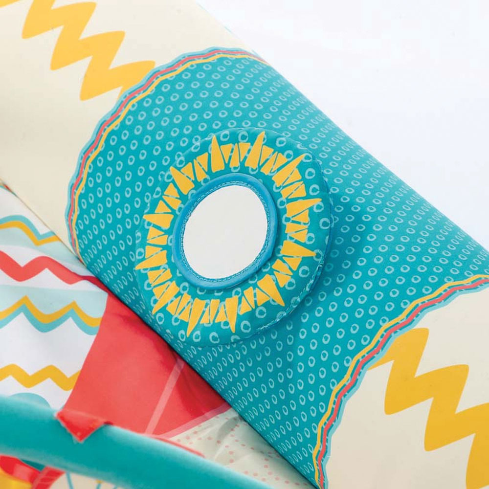 On the mat: a sun-shaped mirror, a teddy bear head which producing a “honk”, a crumpled paper teepee with a little Red Indian inside to play hide-and-seek with, and a felt leaf that slides from side to side…