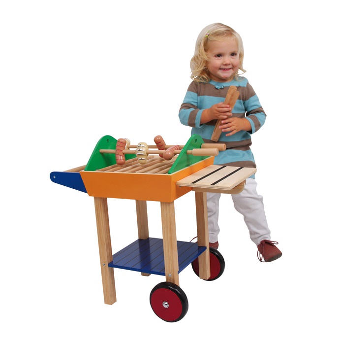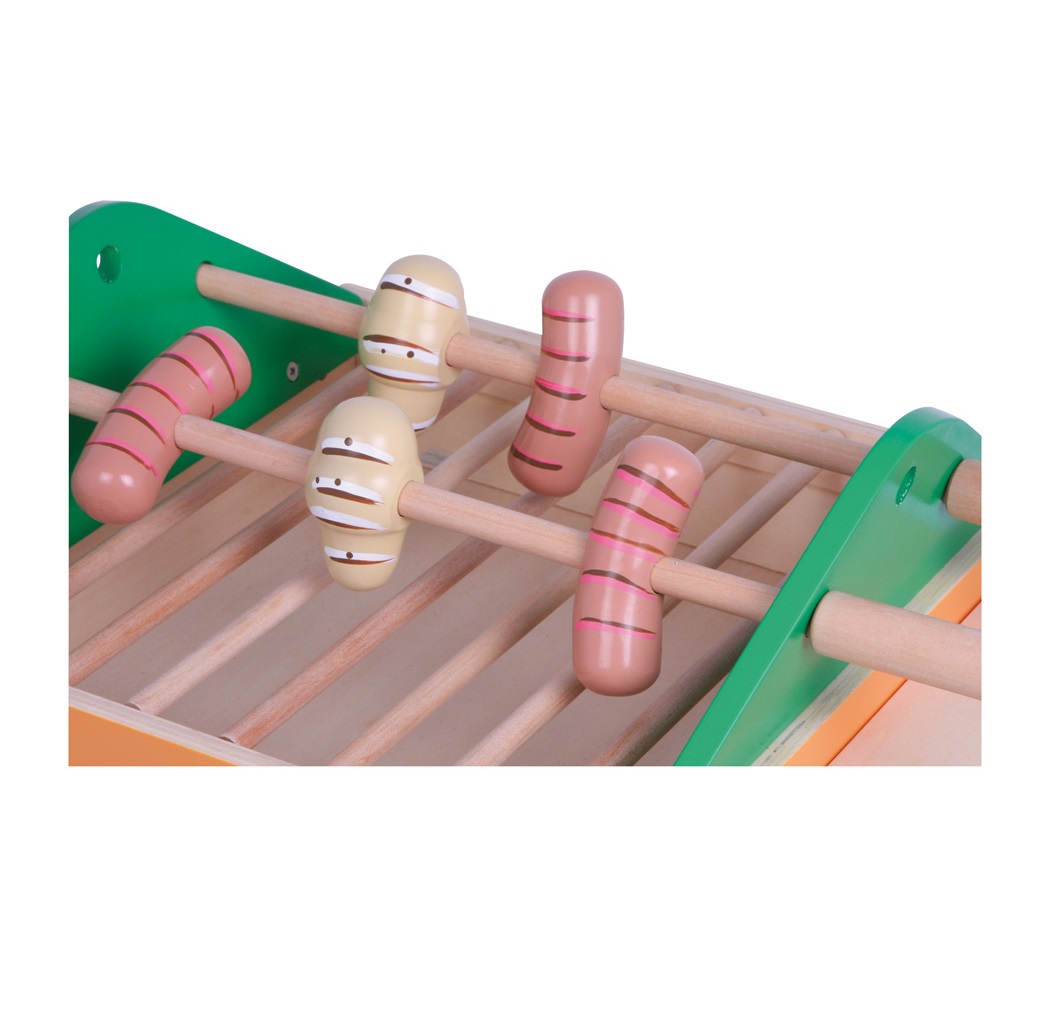 The cart is made of sturdy plywood. The wheels are covered with rubber coatings to ensure a smooth running. 7 wooden bars form the grid, 2 rotating rods serve as a skewer. 5 explicitly painted wooden sausages and a BBQ-tong complete the realistic design! The foldable shelf space with stable latching and the lower storage compartment provide additional play space for toy shop accessories and kitchen utensils.