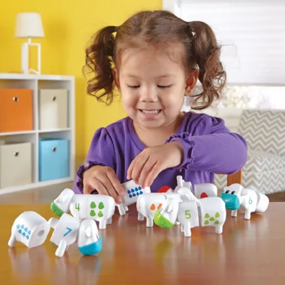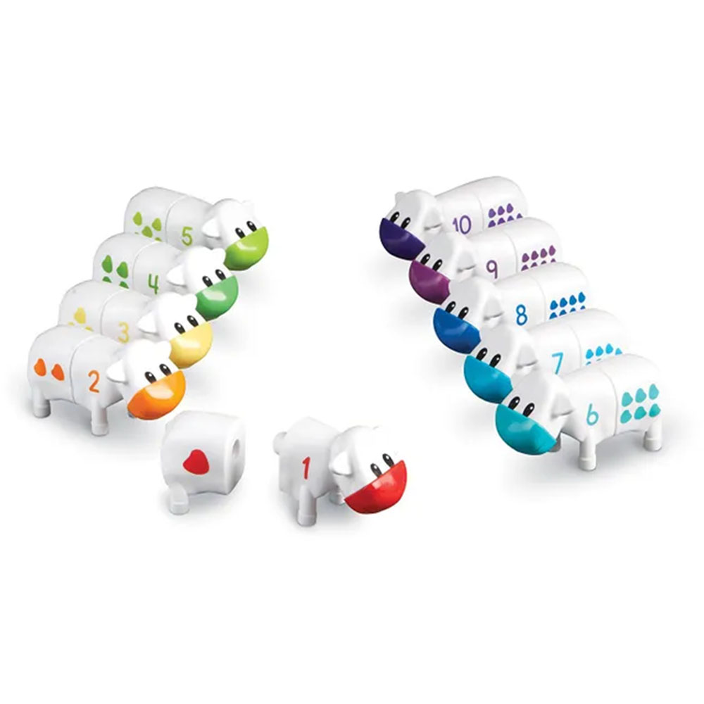 Printed cows are easy for little hands to snap together and pull apart. Activity set encourages a variety of early numeracy skills. Counting (numbers 1-10). Number recognition. Colour Recognition. Matching. Set features ten different colours: green, dark green, turquoise, orange, yellow, red, dark blue, light blue, purple and indigo.
