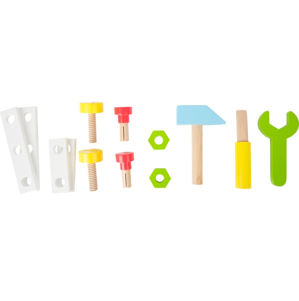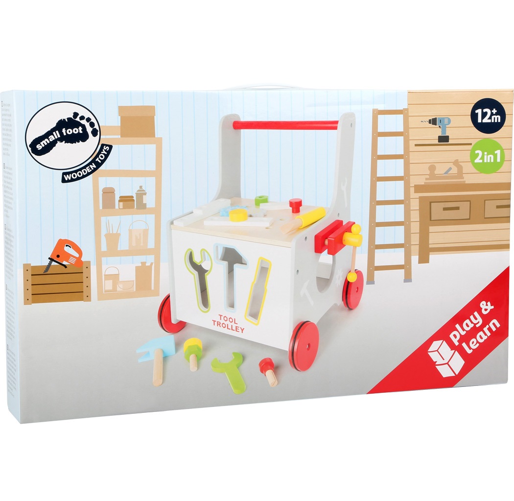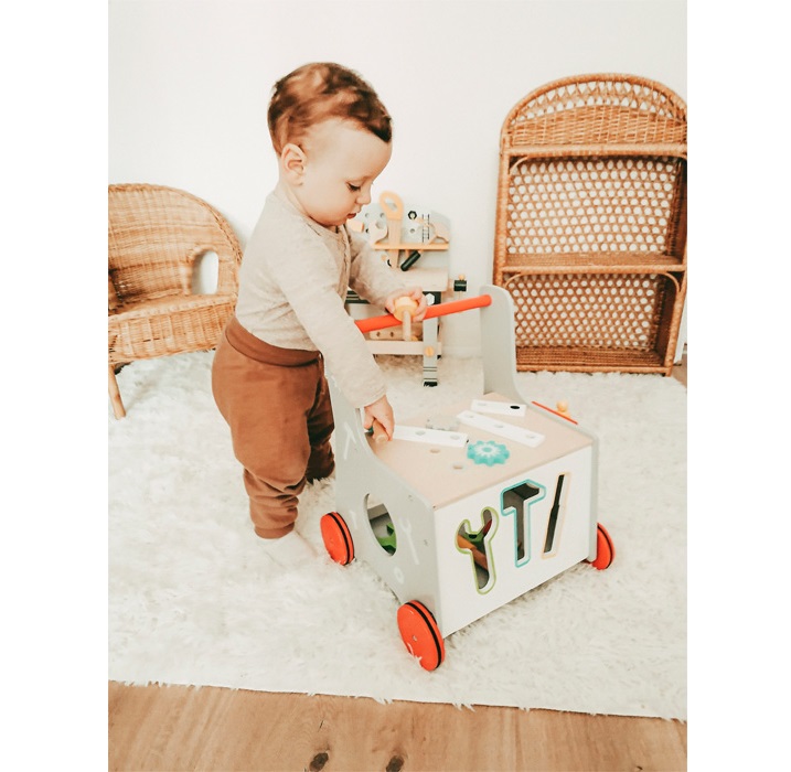 Kids can play with the hammer, screwdriver, and wrench by using the many drill-holes in the upper part of the walker, and the tools can be stored inside – especially by inserting them in the correct opening on the front side. With all kinds of accessories, young kids can screw, drill, and hammer away – there’s even a vice with a rotatable spindle! This baby walker on noise-reducing, slip-resistant rubber-finished wheels trains dexterity and motor skills, and makes young children mobile – a jack of all trades that belongs in every children’s room!