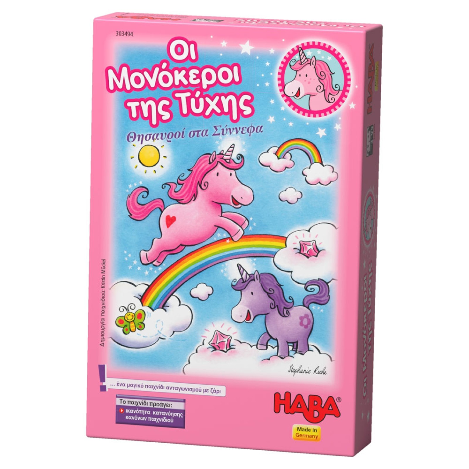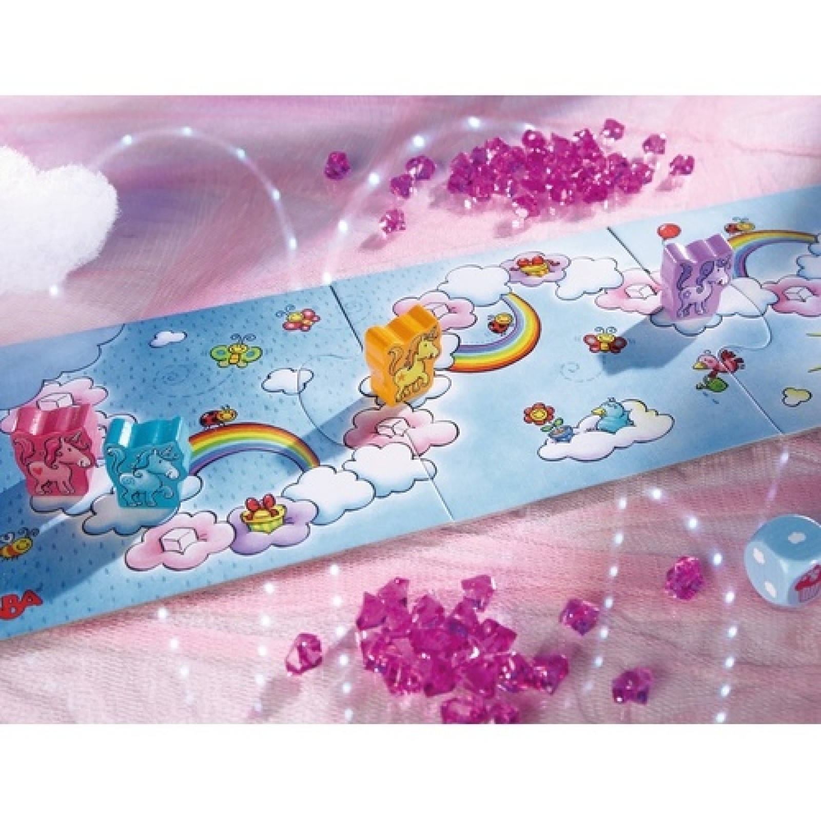 Playfully they gallop across the billowing clouds, slide down the colorful rainbow or play with the cloud crystals. Suddenly a terrible thunderstorm is brewing. On their journey to reach the sun as soon as possible, who will help the unicorns collect the most cloud crystals? Contents: 1 game board, 1 pink unicorn Glitterluck, 1 yellow unicorn Stardust, 1 purple unicorn Marvel Flower, 1 turquoise unicorn Magic Swirl, 60 cloud crystals, 1 pink die with crystal symbols, 1 blue die with cloud symbols, set of game instructions.