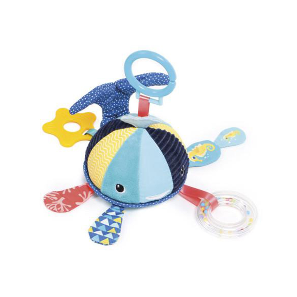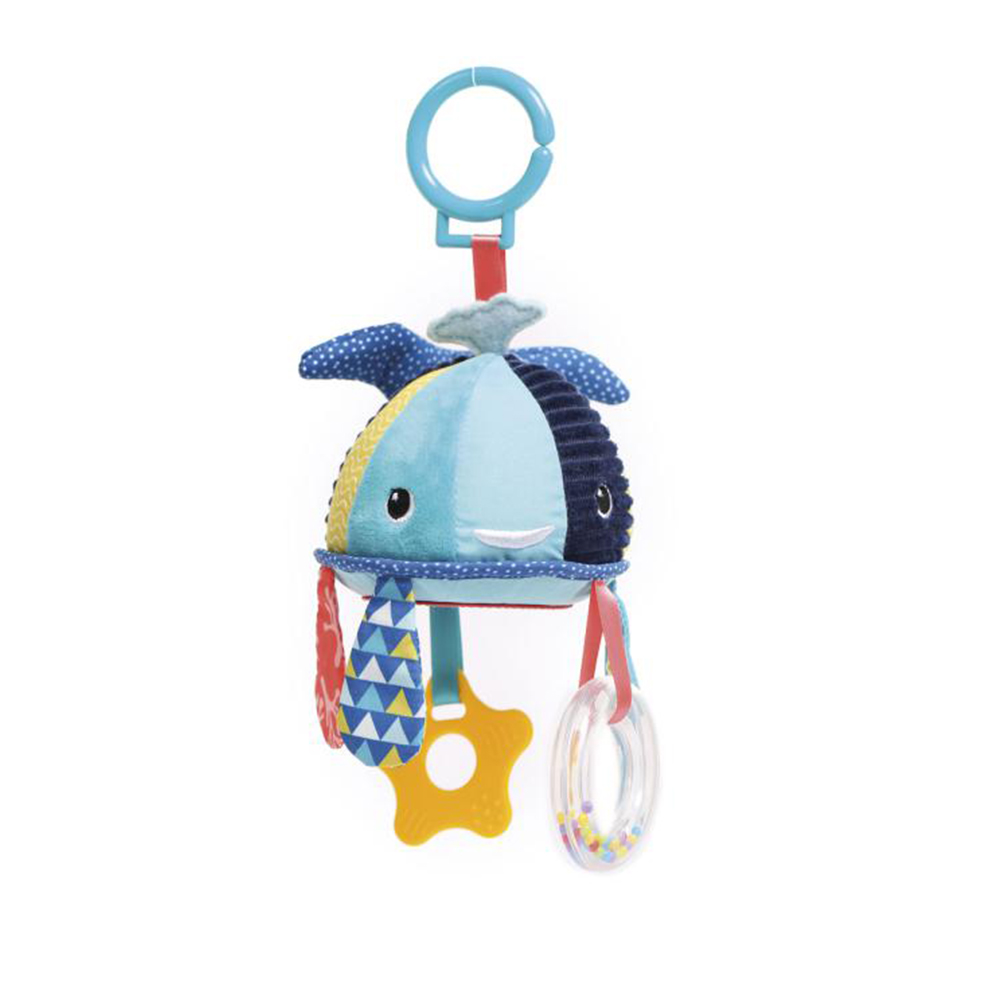 The LUDI Whale Hanging Activity Toy is perfect for babies 3 months and up. With crinkle textures, a teething ring, mirror, and gentle sounds, it stimulates your baby’s senses and encourages early development. Easy to hang on a stroller, crib, or car seat—fun and comfort on the go!