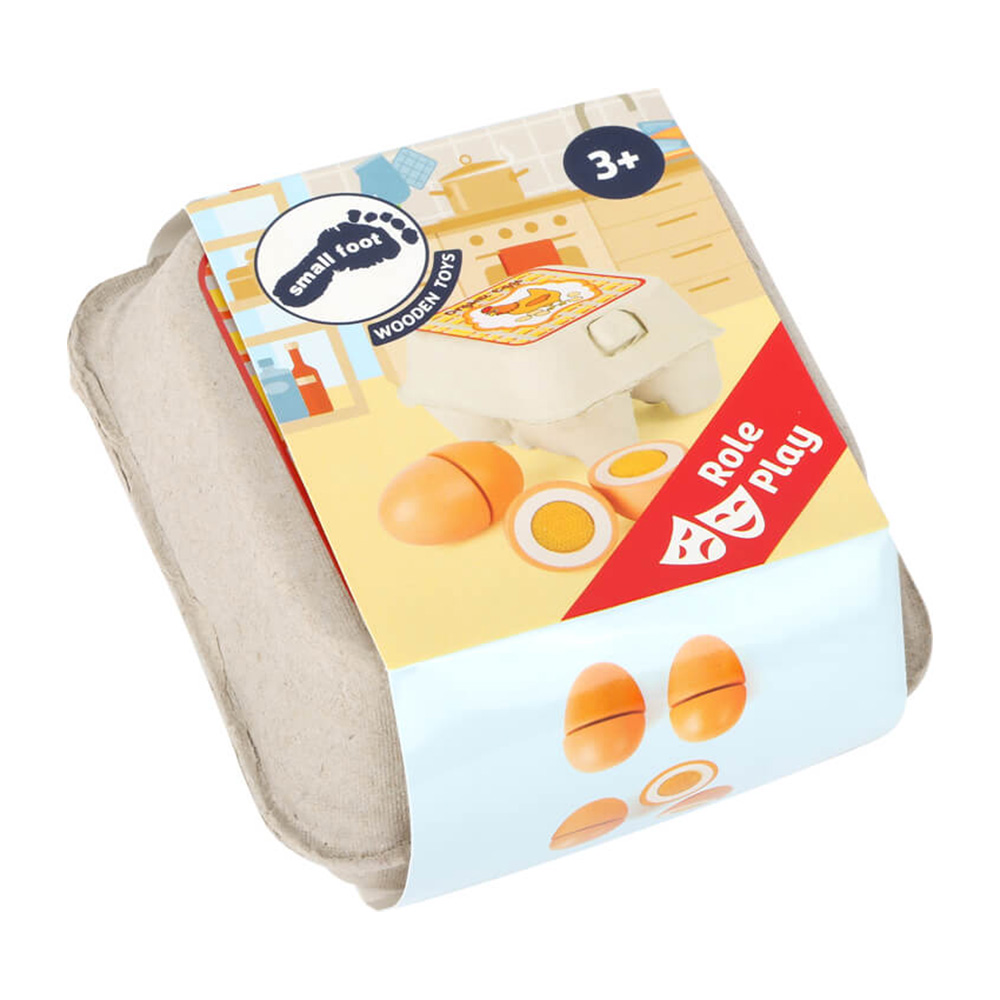 They’re held together with Velcro® and can be separated with the wooden knife. The egg carton made of cardboard stores the eggs for safe transport. So, top chefs, let’s fire up the stove!