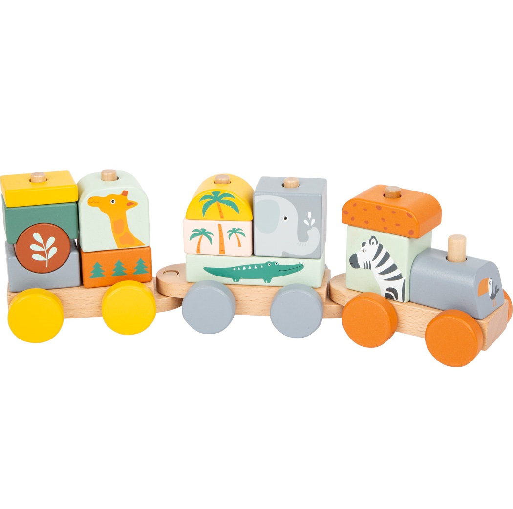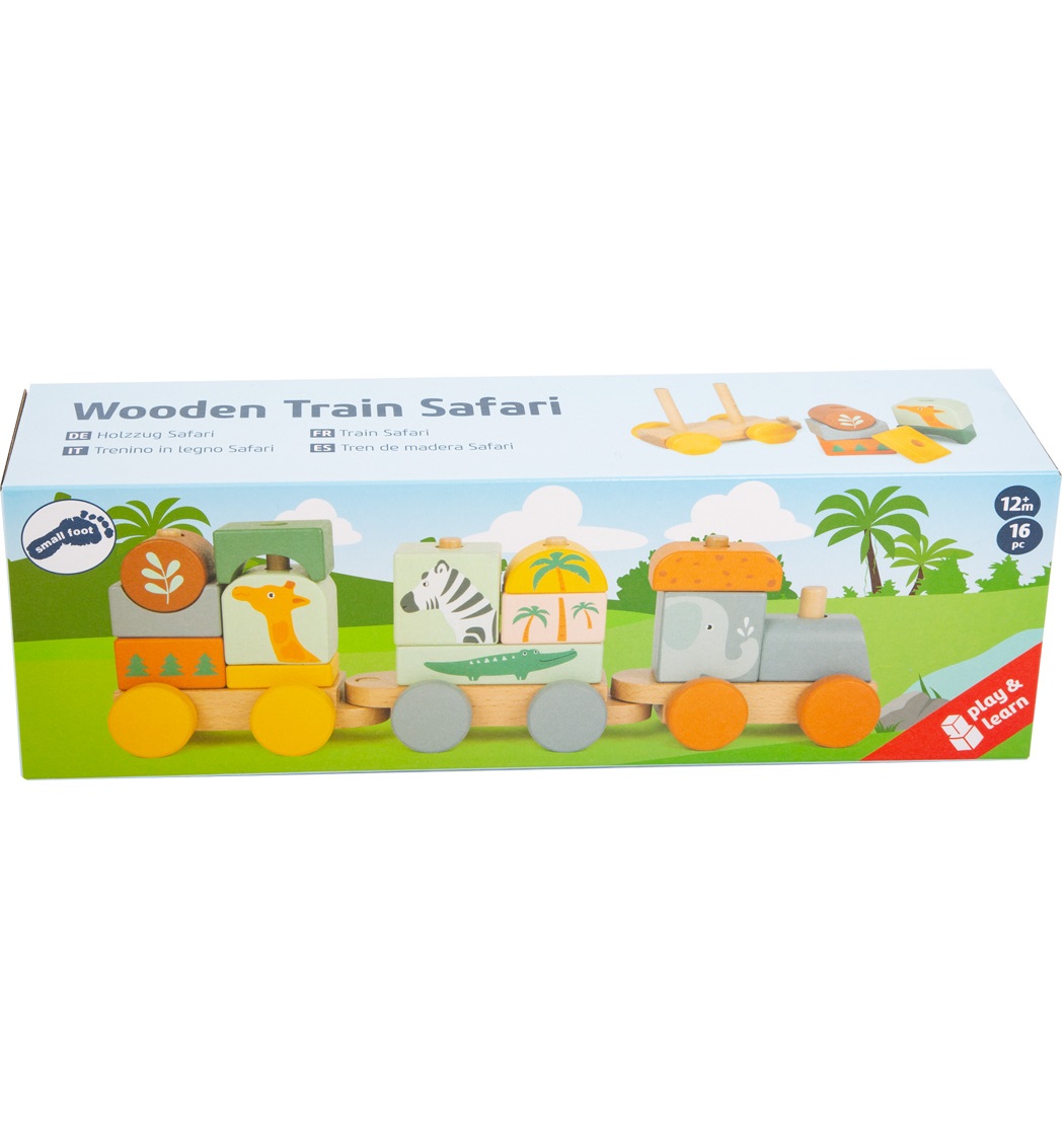 The richly detailed train which is also a shape-fitting and stacking game offers children the possibility to build according to their own ideas. The insertable blocks can also be used separately as building blocks. Next stop: Safari!